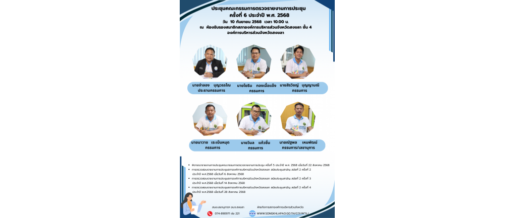 - เพื่อพิจารณารายงานการประชุมคณะกรรมการตรวจรายงานการประชุม ครั้งที่ 5 ประจำปี พ.ศ. 2568 เมื่อวันที่ 22 สิงหาคม 2568 - การตรวจสอบรายงานการประชุมสภาองค์การบริหารส่วนจังหวัดสงขลา สมัยประชุมสามัญ สมัยที่ 2 ครั้งที่ 2 ประจำปี พ.ศ.2568 เมื่อวันที่ 6 สิงหาคม 2568 - การตรวจสอบรายงานการประชุมสภาองค์การบริหารส่วนจังหวัดสงขลา สมัยประชุมสามัญ สมัยที่ 2 ครั้งที่ 3 ประจำปี พ.ศ.2568 เมื่อวันที่ 14 สิงหาคม 2568 - การตรวจสอบรายงานการประชุมสภาองค์การบริหารส่วนจังหวัดสงขลา สมัยประชุมสามัญ สมัยที่ 2 ครั้งที่ 4 ประจำปี พ.ศ.2568 เมื่อวันที่ 28 สิงหาคม 2568